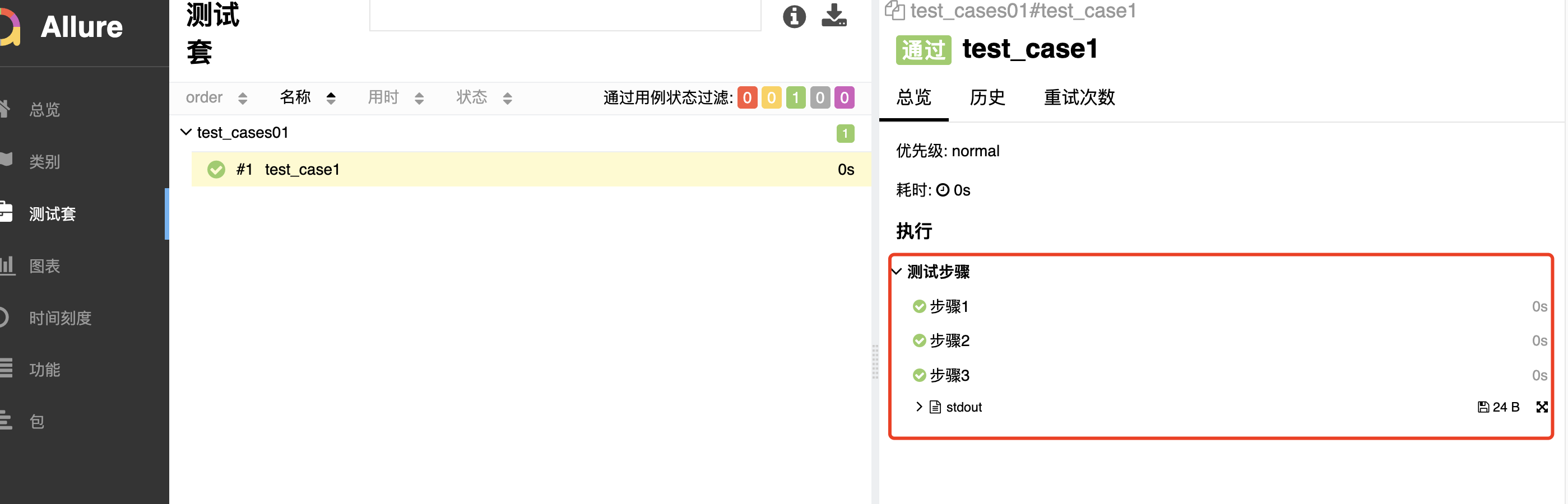 @allure.step("步骤1") def step01(): print("步骤1") @allure.step("步骤2") def step02(): print("步骤2") @allure.step("步骤3") def step03(): print("步骤3") def test_case1(): step01() step02() step03() assert True