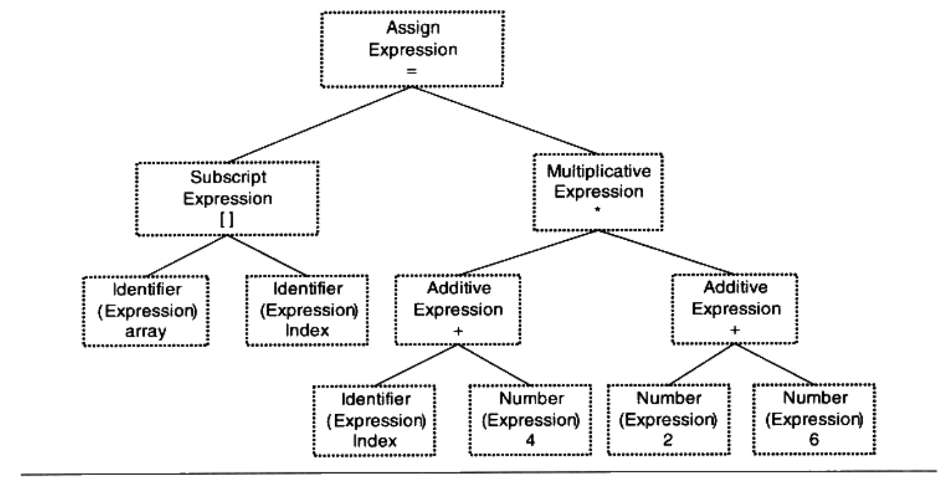 一个语法树的例子,它表示的是array[index] = (index + 4) * (2+6)这样一条语句:
