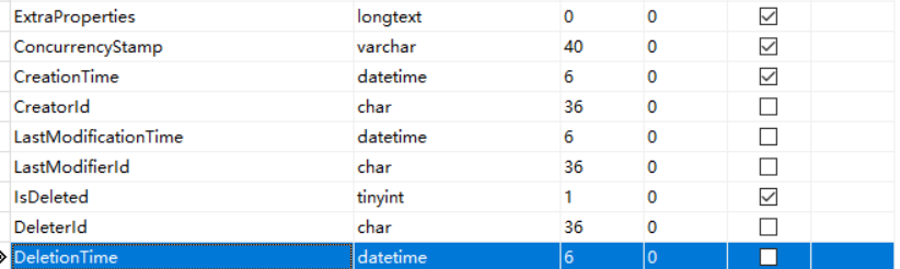 - 映射到数据库表后,表里面会有以下9个公共字段+1个自增主键Id(是Id还是GuId取决于FullAuditedAggregateRoot