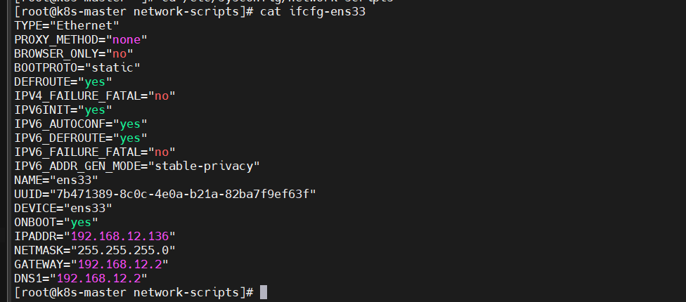 打开ifcfg-ens33文件,将<font style="color:rgb(51, 51, 51);">BOOTPROTO</font>的值从<font style="color:rgb(51, 51, 51);">dhcp</font>改为<font style="color:rgb(51, 51, 51);">static</font>,并在末尾设置静态IP地址、子网掩码、网关和DNS服务器,如下所示