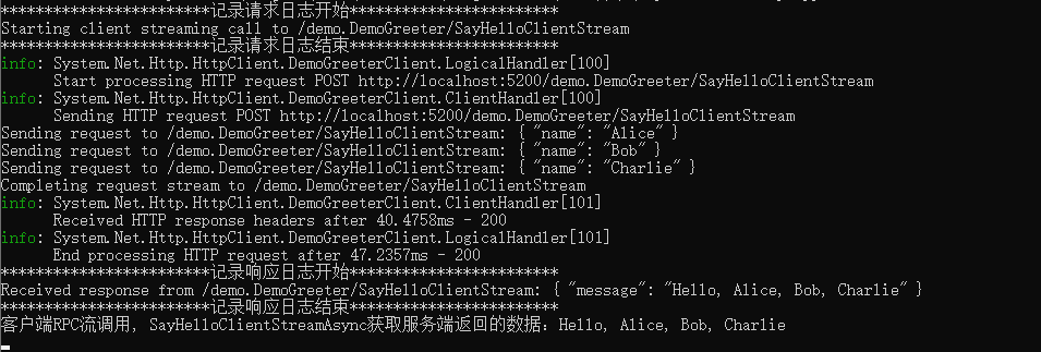 Console.WriteLine($"客户端RPC流调用, SayHelloClientStreamAsync获取服务端返回的数据:{response.Message}");