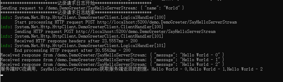 Console.WriteLine($"服务端RPC流调用, SayHelloServerStreamAsync获取服务端返回的数据:{string.Join(",", responses)}");