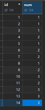 方式二:确保 t2 行的 id 值比 t1 行的 id 值大 1,t3 行的 id 值比 t2 行的 id 值大 1。并且确保 t1 行和 t2 行的 num 值相同,t2 行和 t3 行的 num 值相同。