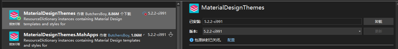 如果不想全局应用Material Design库,想要混合使用原生控件和Material Design控件,可以在需要的窗口中配置Material Design资源字典。只需要把对应的配置放在Window.Resources标签里即可。