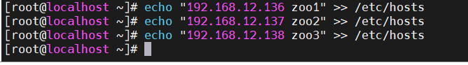 echo "192.168.12.138 zoo3" >> /etc/hosts