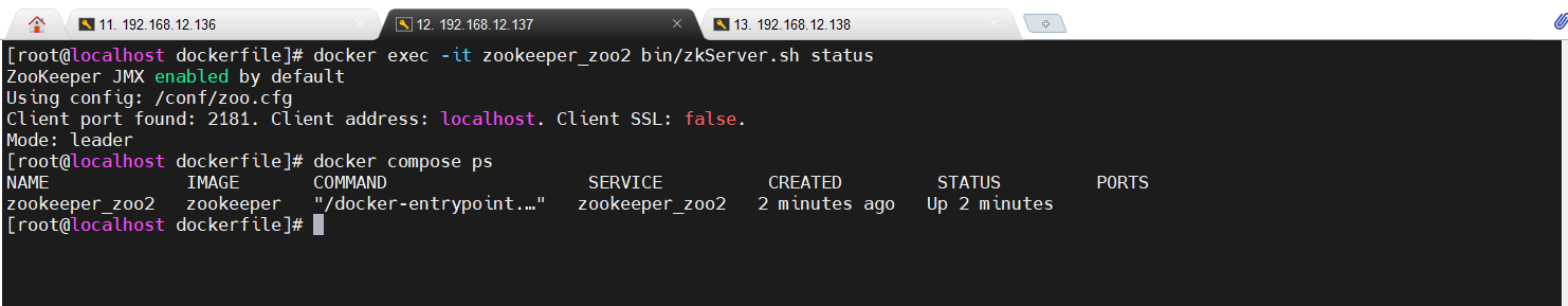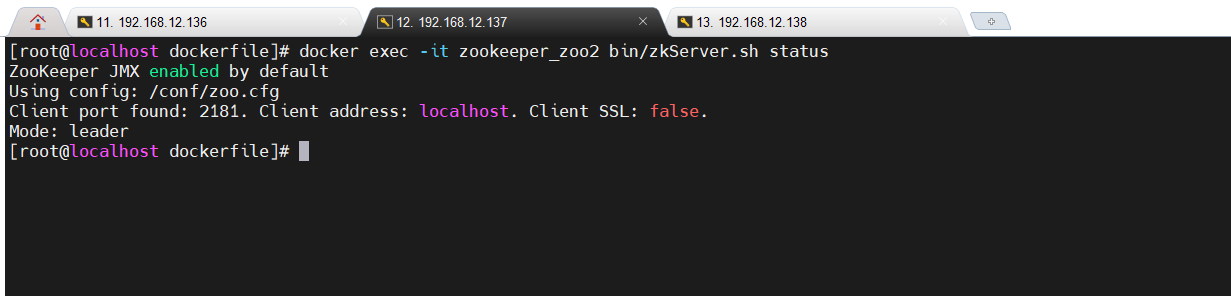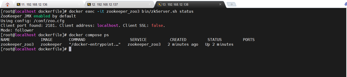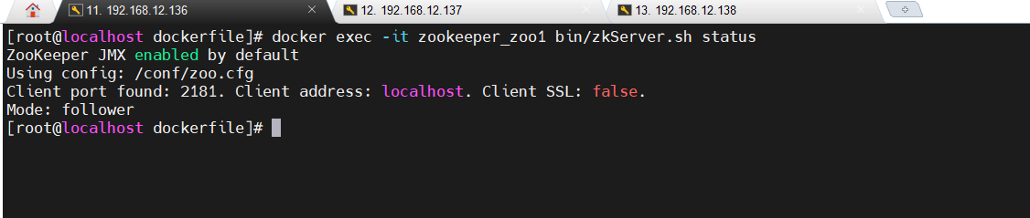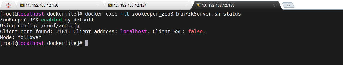 docker exec -it zookeeper_zoo3 bin/zkServer.sh status