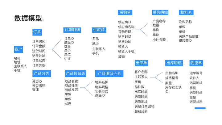 图上的各个表单,其实就是抽象出来的业务数据对象了,不难看出,在进销存的场景里,必然会需要库存、出库单、入库单、仓库这样的数据对象。但这还不够,一个出库单里,势必会遇到需要出库多种产品的情况,也需要录入每种产品需要的数量及成本价等相关属性,这些信息难以在一个数据对象上去完整体现,所以我们还需要建立类似出库明细这样的对象来完善整体的框架。