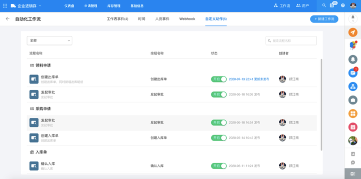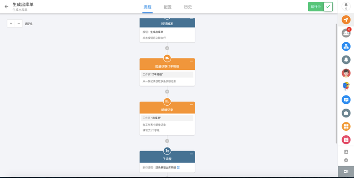 比如,在出库单确认之后,我们需要自动去把库存里相应的产品数量减少,当库存不足时,需要自动发送库存预警通知,从而让采购部人员去进行相应的货物采购。这其中涉及到的很多业务流程和消息提醒,就是用工作流去完成处理的。