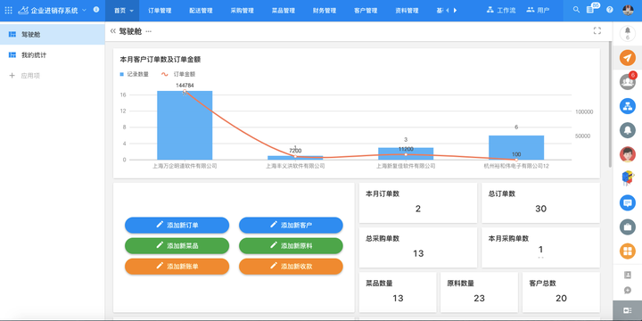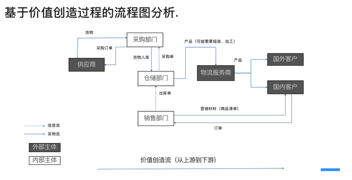 流程的梳理方向,其实也就是产品增值的一个过程,从供货商提供货物,到采购入库,到加工,到出库,到销售给客户。在这其中会有不同的信息传递,整个过程可能就会包含各种各样的指令和单据,例如订单、采购单、出库单等表单,以及订单推进、库存预警、采购通知、库存增减等流程。