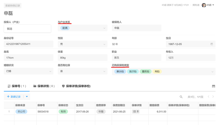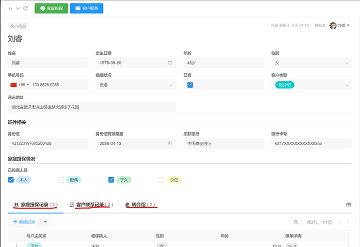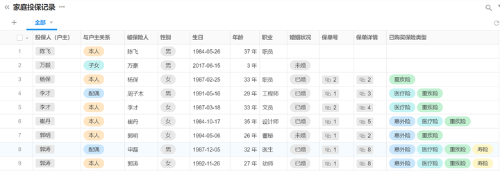 每个人的保险需求都需要根据人生阶段的不断变化动态调整,单身的时候对父母有赡养责任,结了婚对配偶有家庭责任,生了娃对孩子有养育责任,每多一份责任就会多一份保险需求。个人保险客户管理的单位应该是家庭而不是个人,市场上多数这类管理系统没有意识到这点,一个老客户的背后是一个家庭不断增长的保险需求,以及一群转介绍客户等着被发掘。