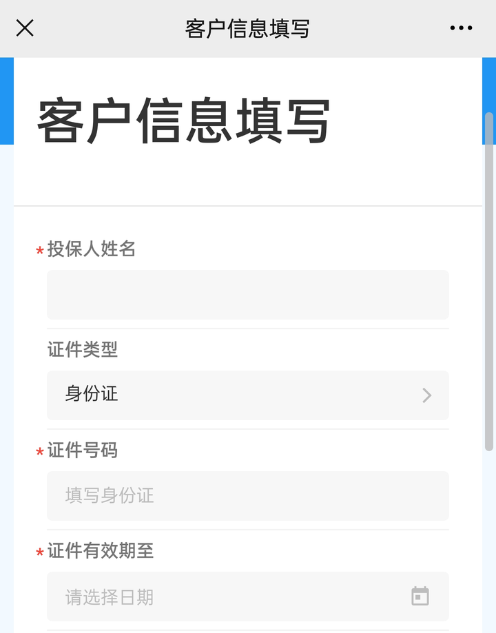 新客户进入签章环节后,业务员需要客户填写投保相关的各类信息。传统做法是给客户发送一个word文档,但word文档在手机上的填写体验是极其糟糕的。为了优化这一环节,我把文档变成了一个在线表单,经过合格设计的在线表单,填写效率比之前提高了一倍以上。