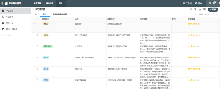 保险公司的各类培训很多,课件、培训资料、产品条款等比较繁杂;各种随时处在调整中的参考文件;团队内部不断讨论打磨过的常见问题解答。总的来说,如何更好地共享信息、沉淀群体智慧是保险团队培训的痛点。一款“all in one”的客户管理系统,不仅能帮助个体保险从业人员对客户进行高效管理,还能在团队管理中发挥重要的作用。