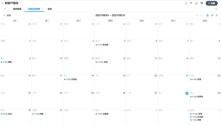 为了不遗忘跟客户的沟通约定,也为了跟进能按计划有条不紊地进行下去,应用里增加了一个沟通提醒的日历看板。