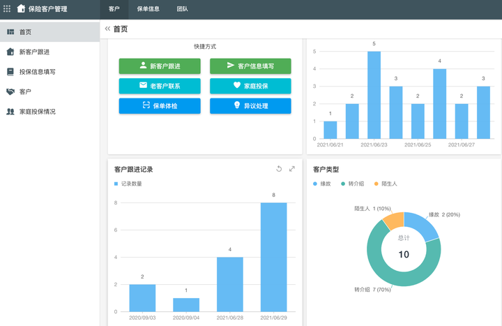 综合以上保险行业的业务痛点,借助零代码应用开发平台,我们打造了一款针对保险行业的客户管理和团队管理系统。以下,我们来逐一细看系统的组成和功能。