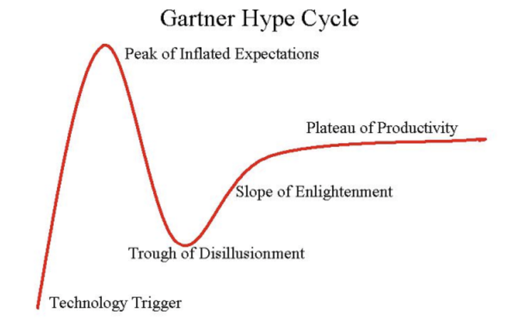 如果我们不分数字化技术的门类,讲整个市场的话,特别是toB市场,数字化进程会是比较平缓的增长曲线;增长趋势是明确的,不可能有剧烈波动。在未来10年-20年时间,可能持续保持这样一个趋势,但是落到现在的每个细分市场、不同门类的市场,波动就会比较剧烈,所以Gartner(全球权威IT市场研究与咨询公司)有一个成熟度曲线。