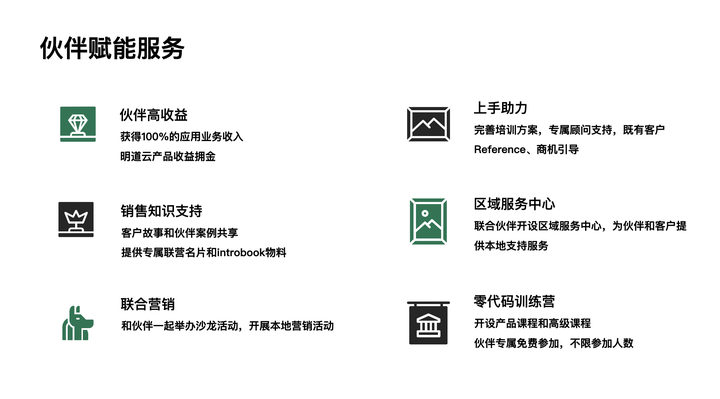 除了业务成绩单好看,明道云的伙伴赋能服务也更加给力。在已有的伙伴权益基础上,今年明道云还新增联合营销活动支持、建设区域服务中心、稳定开设每月零代码训练营等伙伴赋能服务。