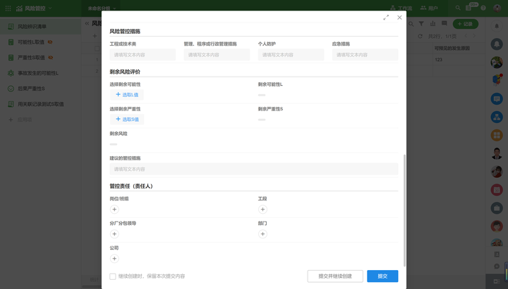 员工可以通过提交风险辨识清单,管控项目工程中的风险内容。通过这部分风险内容,结合关联的可能性L和严重性S,给到风险进行分数评估。而后,系统会自动评判剩余风险。系统根据不同取值得分,将风险分发至不同的流程分支,再交由相关人员进行管理。