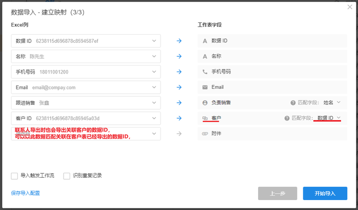 「联系人」和「客户」表有关联关系,如果要在导入联系人时就自动关联客户数据,则要在导入联系人时,根据联系人Excel表的客户ID,去客户表中根据数据ID字段查询数据。如果系统能找到对应的数据,就能自动关联。建立字段映射时注意下图的选择。