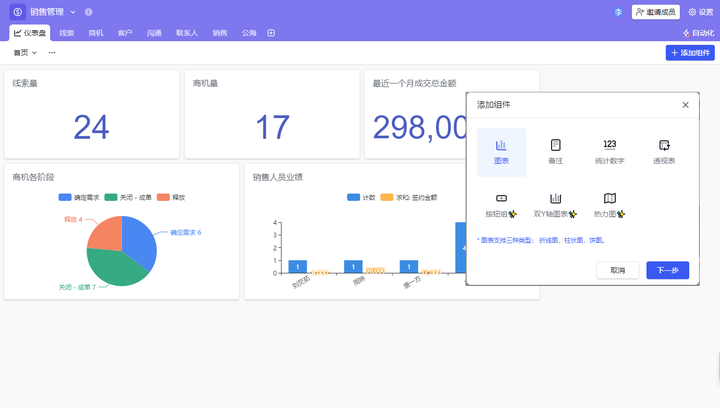 统计图是帮助管理者科学决策必不可少的功能。黑帕云目前提供的统计图型和组件能力较少,明道云都能覆盖,并提供更多灵活功能。
