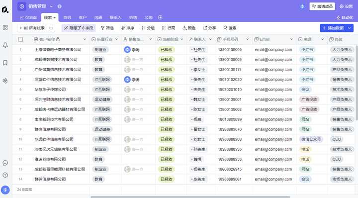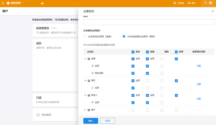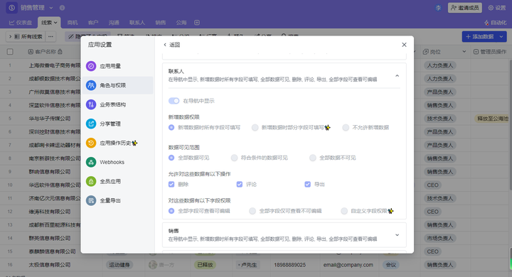 和黑帕云配置角色权限不同的是,明道云能精确控制每个用户可增删改查的工作表视图、数据、甚至字段。另外,明道云还支持控制用户数据录入、数据导出、评论和查看日志等权限。