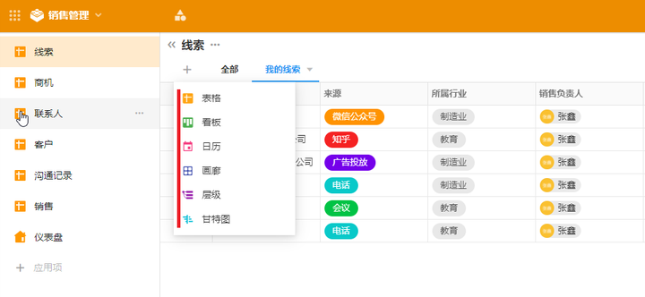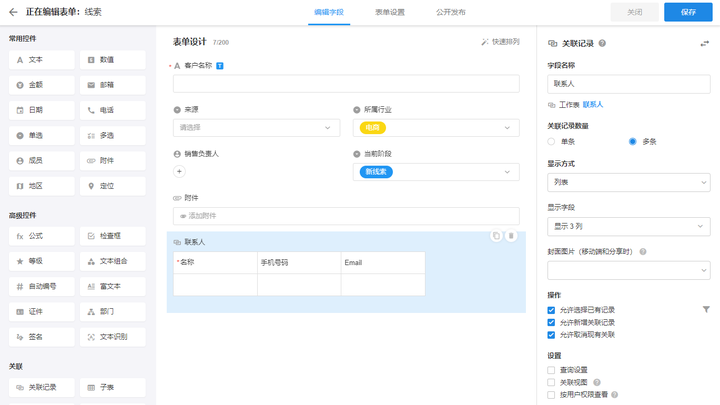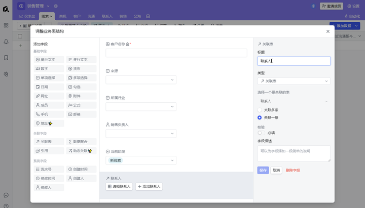 以「销售管理」应用中「客户」和「联系人」两张表为例,它们之间有一对多的关联关系,即:一家客户可以关联多个联系人,1个联系人只能归属于1家客户。