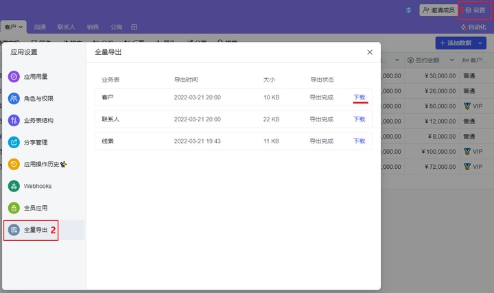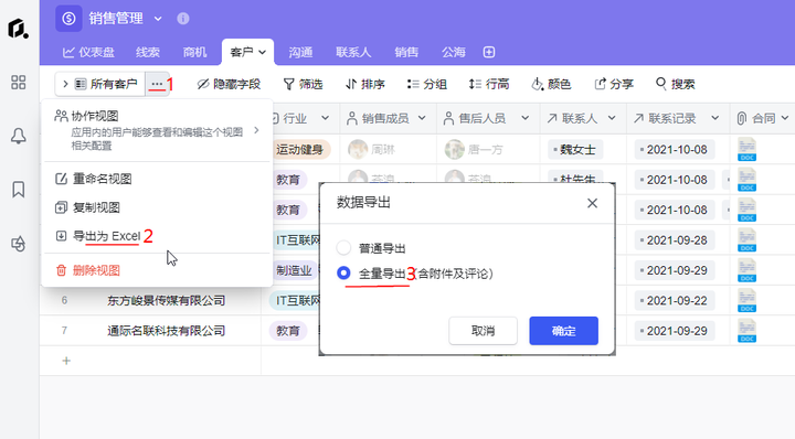 选择能够显示全部数据的视图(不要隐藏字段或设置筛选条件),然后全量导出为Excel。分别导出客户数据和联系人数据。
