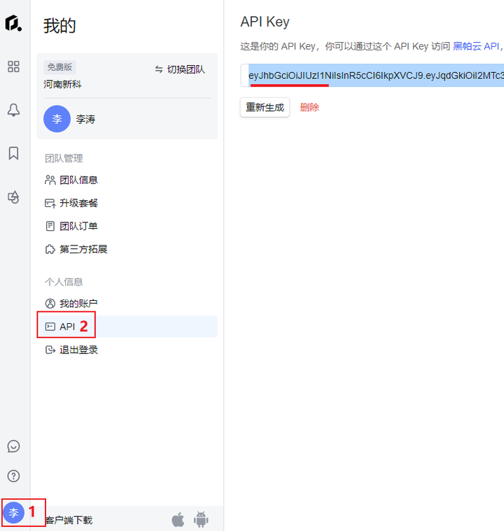 参考下图操作,进入「我的」-「API」,获得API Key。