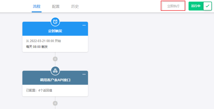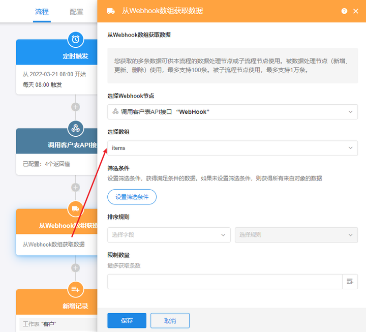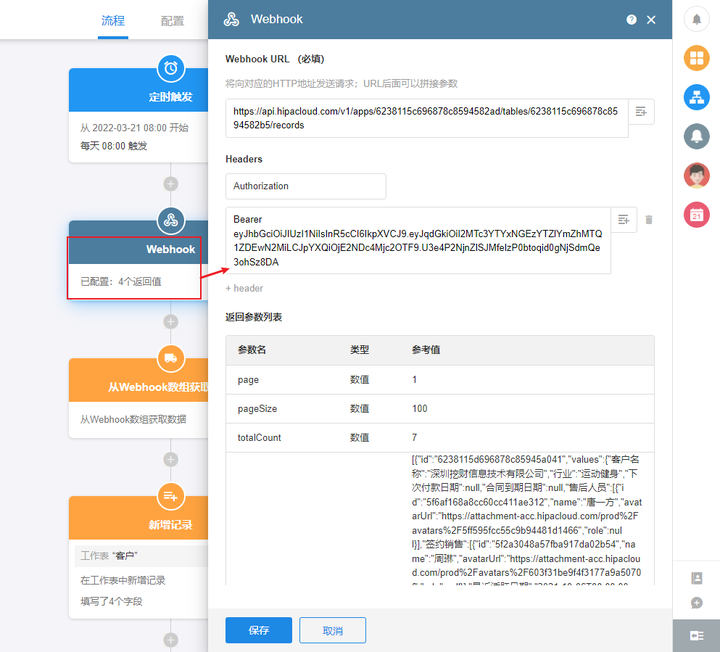 流程触发后,通过Webhook节点,调用「客户」表API接口,获取数据。