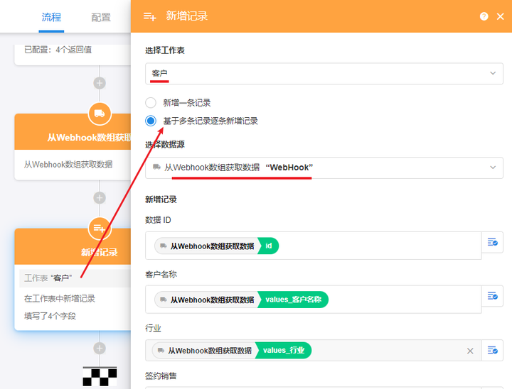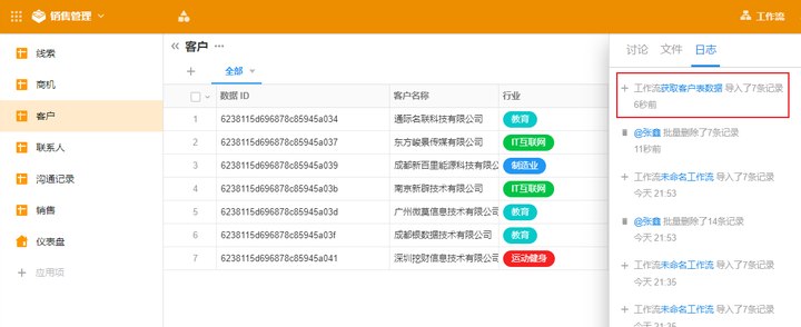 通过新增节点,批量将客户数据新增到客户表中。在把获取的表数据写入对应字段的同时,记得把数据ID也写入工作表。
