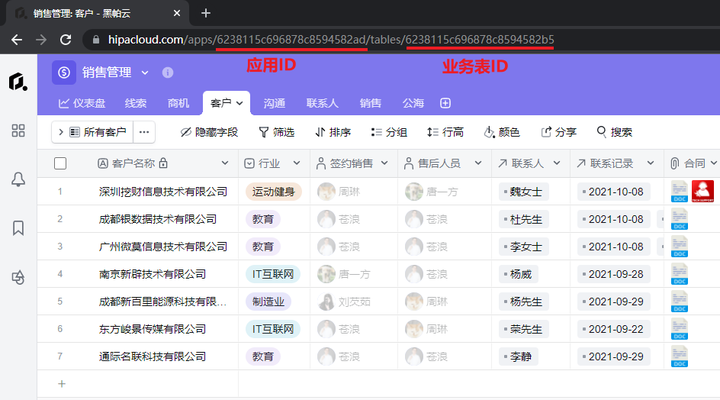 虽然所有业务表的ID不同,但获取方式相同。在黑帕云的每个应用的每个业务表界面里,你可以从网址链接中获得相应的应用ID和业务表ID,参考下图