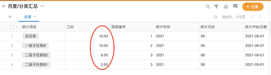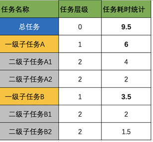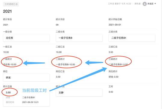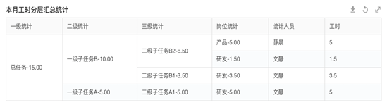 例如:在将工作任务逐级分解执行后,需要再根据员工的日报逐级进行工时汇总,一项工作任务可以关联到任何一级任务。下图这个任务工时统计,就将从总任务到二级子任务的各级任务都逐级进行数据汇总。