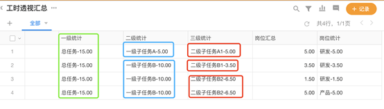 完成这些配置和数据录入后,各个日报的数据里就会分别显示上面各级的汇总信息,并且实现一个增强版本的透视图效果。