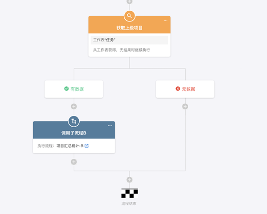 然后按照层级关系逐级累加,并且将各级汇总数据关联到当前记录。在逐层累加的设计中我们使用了A、B子流程循环调用的模式,子流程中封装了累加当前层级汇总数据和关联数据源表记录的逻辑。一个子流程处理完成后,只需要判断当前计算的层级是否还有上级,如有就调用另一个相同结构的子流程B继续进行累加,循环往复。