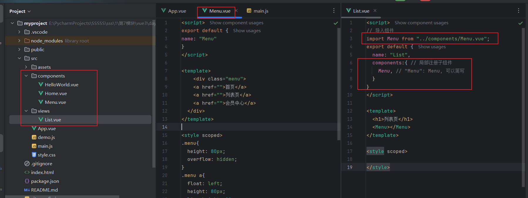 <script> // 导入组件 import Menu from "../components/Menu.vue"; export default { name: "List", components:{ // 局部注册子组件 Menu, // "Menu": Menu, 可以简写 } } </script> <template> <h1>列表页</h1> <Menu></Menu> </template> <style scoped> </style>