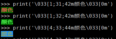 \033[显示方式;前景字体色;背景色m \033[0m 结尾可省略, 但是不建议.