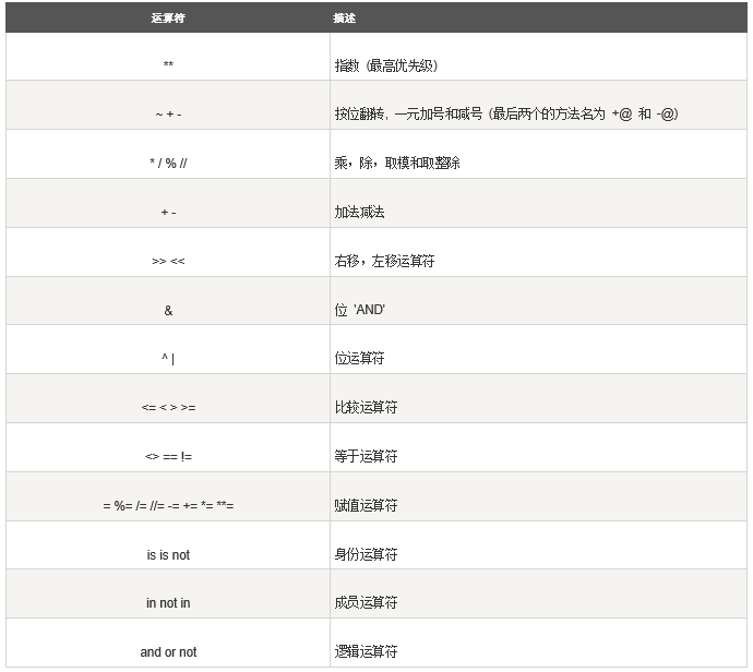 运算符按种类可分为算数运算、比较运算、逻辑运算、赋值运算、成员运算、身份运算、位运算