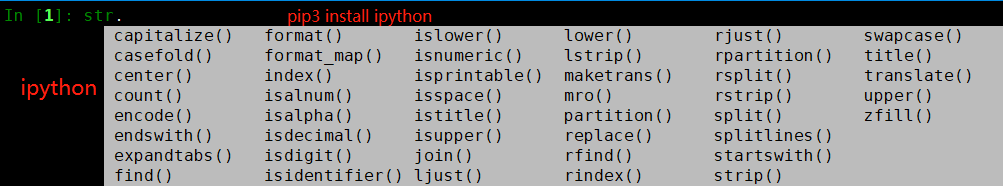 # 大小写 captalize, swapcase, title >>> tty='what is Python?' >>> print(tty.capitalize()) #首字母大写 What is python? >>> print(tty.swapcase()) #大小写翻转 WHAT IS pYTHON? >>> print(tty.title()) #每个单词首字母大写 What Is Python? >>> print(tty.upper()) #全部大写 WHAT IS PYTHON? >>> print(tty.lower()) #全部小写 what is python? # 居中,center 参数-->10为总长度,空白处填充= >>> tty='12345' >>> print(tty.center(10)) >>> print(tty.center(10,"=")) ==12345=== # 字符串中某元素出现的次数 count >>> tty='mingetty' >>> print(tty.count("t")) >>> print(tty.count("t",0,5)) #可以指定切片位置 >>> print(tty.count("mi")) >>> print(tty.count("ni")) # 凑8位补全 expandtabs 把字符串中的 tab 符号('\t')转为空格 , ()默认为8. # tab默认为8个空格. 如果tab前面的字符长度不足8,则字符串加tab一共补全至8位,如果tab键前面的字符长度超过8个不足16个则补全至16位,以此类推每次补全至加8位 >>> tty='a\tb' >>> print(tty.expandtabs()) a b >>> print(tty.expandtabs(0)) ab >>> print(tty.expandtabs(1)) a b >>> print(tty.expandtabs(2)) a b >>> print(tty.expandtabs(3)) a b >>> tty='12345678\t0' >>> print(tty.expandtabs()) 0 >>> tty='123456789\t0' >>> print(tty.expandtabs()) 0 >>> tty='1234567890\t0' >>> print(tty.expandtabs()) 0 # 判断是否以...开头结尾 startswith endswith >>> t3='pythonpylife' >>> print(t3.startswith('py')) True >>> print(t3.startswith('py',6,11)) #返回的是布尔值 True >>> print(t3.endswith('fe')) True >>> print(t3.endswith('if',6,10)) False >>> print(t3.endswith('if',6,11)) True # 寻找字符串中某元素是否存在 find index >>> t3='pythonpylife' >>> print(t3.find('py')) >>> print(t3.find('py',1,10)) # 返回的是找到的元素的索引,如果找不到返回-1 >>> print(t3.find('py',7,10)) -1 >>> print(t3.index('py',1,10)) # 返回的是找到的元素的索引,找不到就报错。 >>> print(t3.index('py',7,10)) Traceback (most recent call last): File "<stdin>", line 1, in <module> ValueError: substring not found # split rsplit 以什么分割(正反方向),最终形成一个列表, 此列表不含这个分割的元素 >>> tty1 = 'title,Tilte,atre,'.split('t') >>> print(tty1) ['', 'i', 'le,Til', 'e,a', 're,'] >>> tty1 = 'title,Tilte,atre,'.split('t',1) >>> print(tty1) ['', 'itle,Tilte,atre,'] >>> tty1 = 'title,Tilte,atre,'.split('t',2) >>> print(tty1) ['', 'i', 'le,Tilte,atre,'] >>> tty1 = 'title,Tilte,atre,'.split('t',3) >>> print(tty1) ['', 'i', 'le,Til', 'e,atre,'] >>> tty1 = 'title,Tilte,atre,'.split('t',-1) >>> print(tty1) ['', 'i', 'le,Til', 'e,a', 're,'] >>> tty2 = 'title,Tilte,atre,'.rsplit('t') >>> print(tty2) ['', 'i', 'le,Til', 'e,a', 're,'] >>> tty2 = 'title,Tilte,atre,'.rsplit('t',1) >>> print(tty2) ['title,Tilte,a', 're,'] >>> tty2 = 'title,Tilte,atre,'.rsplit('t',2) >>> print(tty2) ['title,Til', 'e,a', 're,'] # format的三种玩法 格式化输出 >>> res='{} {} {}'.format('egon',18,'male') >>> print(res) egon 18 male >>> res='{1} {0} {1}'.format('egon',18,'male') >>> print(res) egon 18 >>> res='{name} {age} {sex}'.format(sex='male',name='egon',age=18) >>> print(res) egon 18 male # strip lstrip rstrip 移除字符串头尾指定的字符(默认为空格或换行符)或字符序列。 注意:该方法只能删除开头或是结尾的字符,不能删除中间部分的字符。 >>> t1=' *=wuhm**' >>> print(t1.strip()) *=wuhm** >>> t2='*=wuhm**' >>> print(t2.strip('*')) =wuhm >>> print(t2.lstrip('*')) =wuhm** >>> print(t2.rstrip('*')) *=wuhm >>> print(t2.rstrip('=')) *=wuhm** >>> print(t2.lstrip('=')) *=wuhm** # replace 替换字符串,如果指定第三个参数 次数,则替换不超过几次 >>> py='new say :my name is new! new!' >>> print(py.replace('new','old')) old say :my name is old! old! >>> print(py.replace('new','old',1)) old say :my name is new! new! >>> print(py.replace('new','old',2)) # 2 为次数 old say :my name is old! new! # is 判断系列 >>> t1='abc123' >>> print(t1.isalnum()) #字符串由字母或数字组成 True >>> print(t1.isalpha()) #字符串只由字母组成 False >>> print(t1.isdigit()) #字符串只由数字组成 False >>> t2='abc' >>> print(t2.isalnum()) True >>> print(t2.isalpha()) True >>> print(t2.isdigit()) False >>> t3='123' >>> print(t3.isalnum()) True >>> print(t3.isalpha()) False >>> print(t3.isdigit()) True