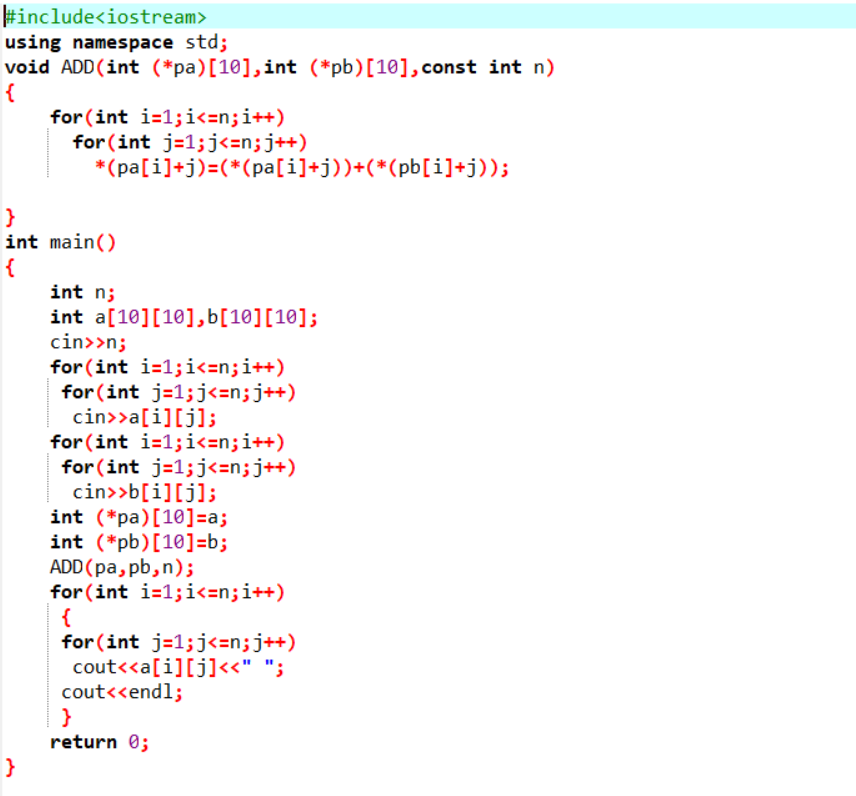 实现函数 void ADD(int (*pa)[10],int(*pb)[10],const int n)