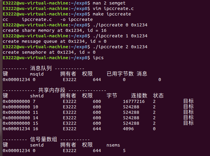 例题:程序 ipccreate 用于在指定的键值上创建 ipc 内核对象。使用格式为 ./ipccreate ,比如