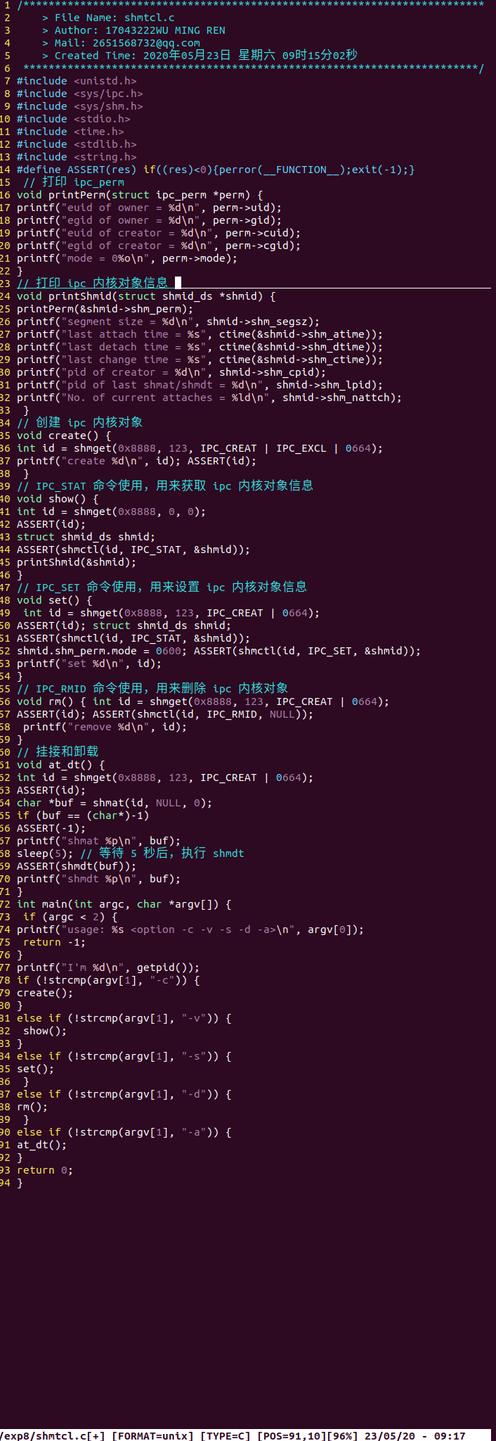 例题:编写一个程序 shmctl 可以用来创建、删除内核对象,也可以挂接、卸载共享内存,还可以打印、设置内核对象信息。