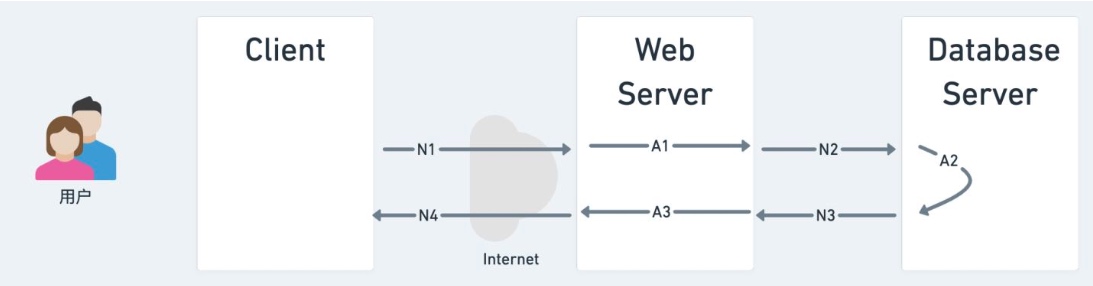 如下图所示,以一个简单的客户端-服务器-数据库的应用架构来看,响应时间可以被分解为网络传输时间(N1+N2+N3+N4)和应用延迟时间(A1+A2+A3),而应用延迟时间又可以分解为数据库延迟时间(A2)和应用服务器延迟时间(A1+A3)。对响应时间进行分解使得我们能够更有效率得定位性能瓶颈。