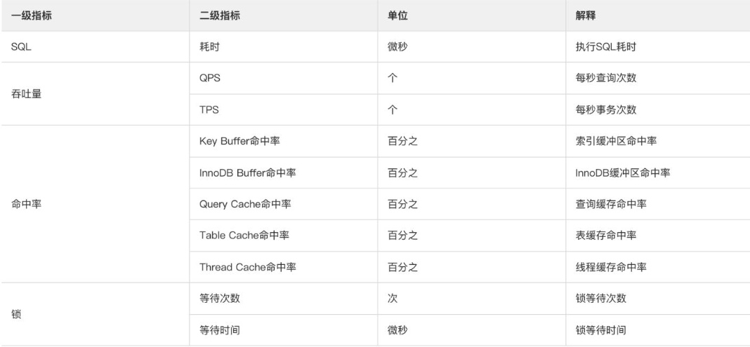 常用的数据库例如MySQL指标主要包括SQL、吞吐量、缓存命中率、连接数等,具体如下: