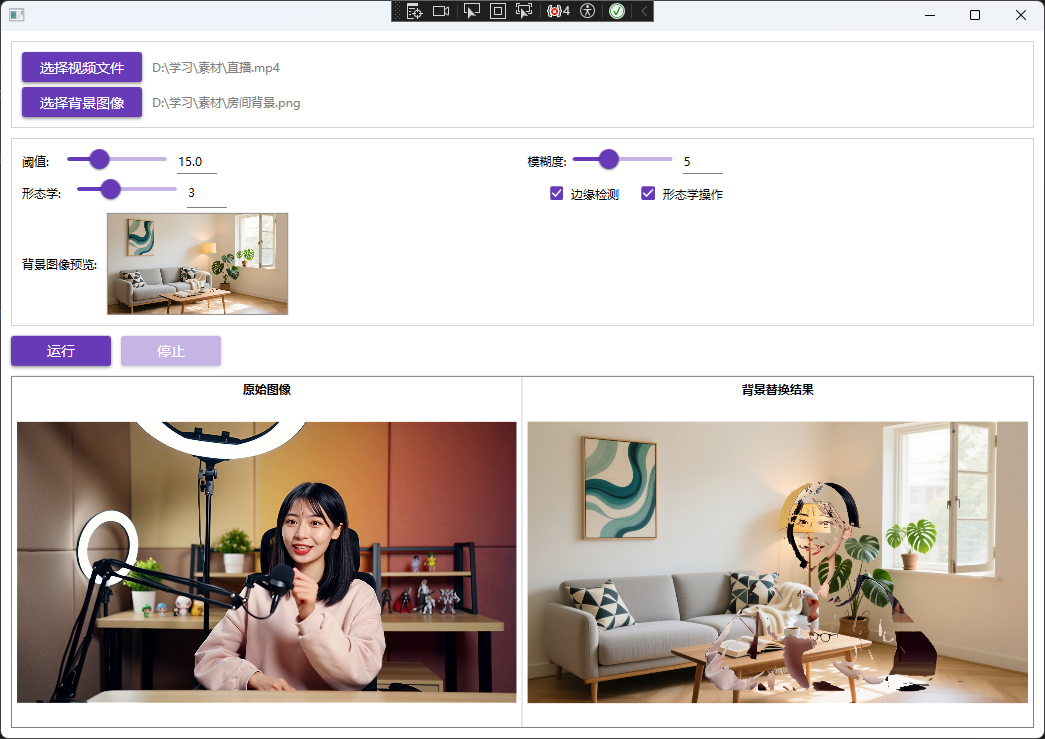 现在需要将原始视频帧的前景与新的背景图像进行融合,核心思想是使用前景掩码来决定哪些像素保留原始帧,哪些像素使用背景图像。
