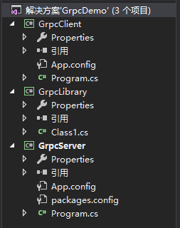 添加 - 新建项目 - 类库 GrpcLibrary。 工程中的三个项目情况如下: