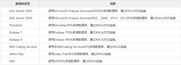Spreadsheet在系统上是通过创建多维数据源,以XMLA服务器连接一个本地或远程的多维数据库的,它支持的多维数据库类型有以下这些: