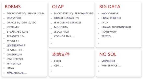 而目前主流的一些数据来源大概可以分为下图几大模块,关系数据库(RDBMS)、多维数据库(OLAP)、大数据库(BIGDATA)、本地文件、非关系型数据库(NOSQL)等,所以是否支持这些数据来源以及支持的情况如何,也成为BI工具选型的一个考量因素。