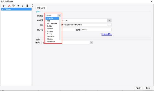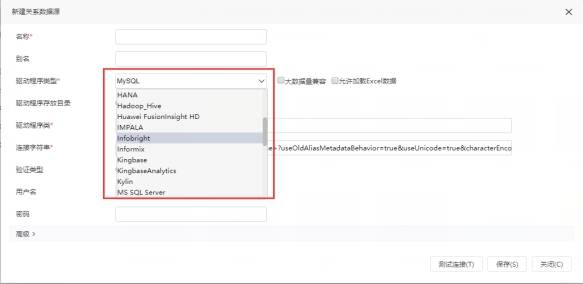 Spreasheet与FineRepoet都支持通过jdbc驱动连接关系型数据库,比如常见的Mysql、Oracle、MS SQL等,但从创建连接界面看,Spreadsheet支持的关系型数据库是比FineReport要多的,而且Spreadsheet可以添加自定义jdbc驱动,以适配不同数据库版本,比如Oracle对驱动版本要求比较高,BI工具内置的驱动版本可能与我们要连接的数据库版本不匹配,导致连接会出现问题,那么此时使用添加自定义驱动就可以解决这种版本适配问题了。