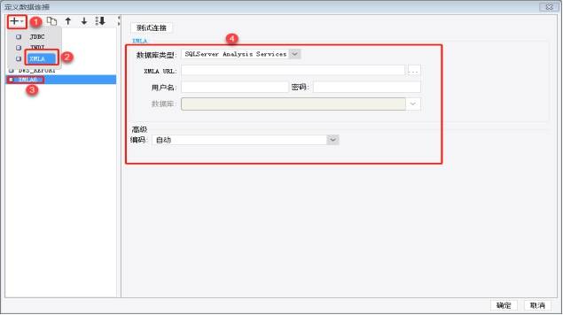 FineReport 也可以通过XMLA数据连接方式支持市场上主流的 SQLServer Analysis Services、Oracle Essbase、SAP HANA 等数据库类型,但是要在工具上使用多维数据库的话,必须购买安装多维数据集插件,安装完成之后才会出现创建入口。