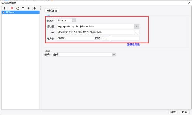 -INF\lib下,并重启报表服务器,然后在数据连接界面选择others,自行配置Kylin的驱动连接url以及其他相关信息后,才能正常连接,整个过程会显得比较繁琐。