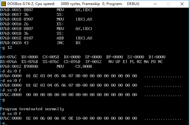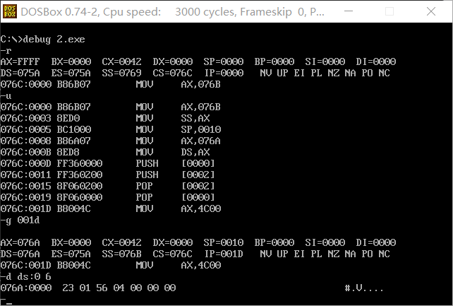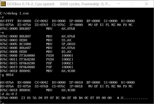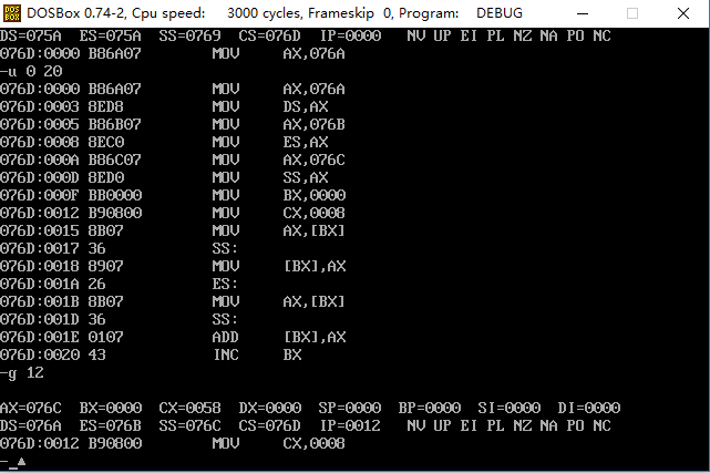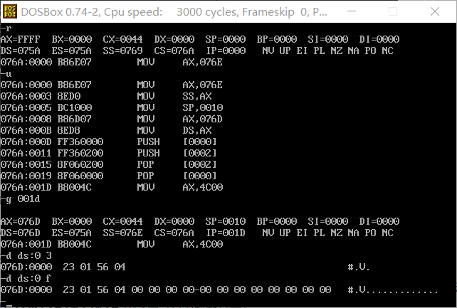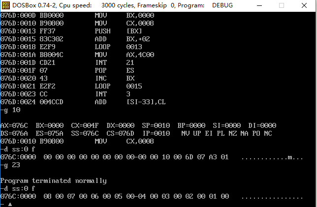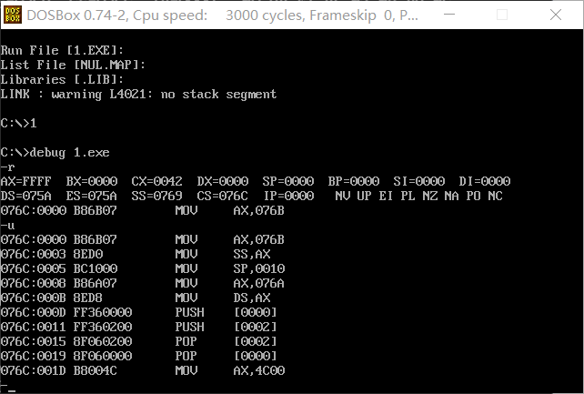 (2)在程序返回前我们可以发现,cs=076C ,ss=076B,ds=076A